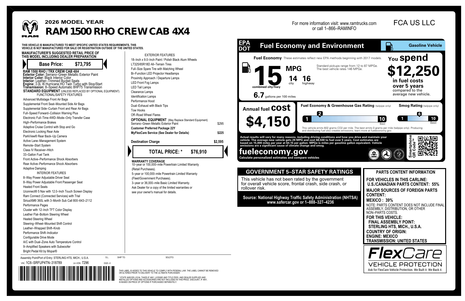 Turn heads in the 2026 RAM 1500 RHO — a striking Green exterior wrapped in a sleek Black interior. Muscular capability meets refined comfort: confident towing and hauling, a composed ride, and modern in-cabin tech and connectivity to keep every drive enjoyable. Backed by factory basic, powertrain and rust warranties for added peace of mind — stop by today for details and a test drive.