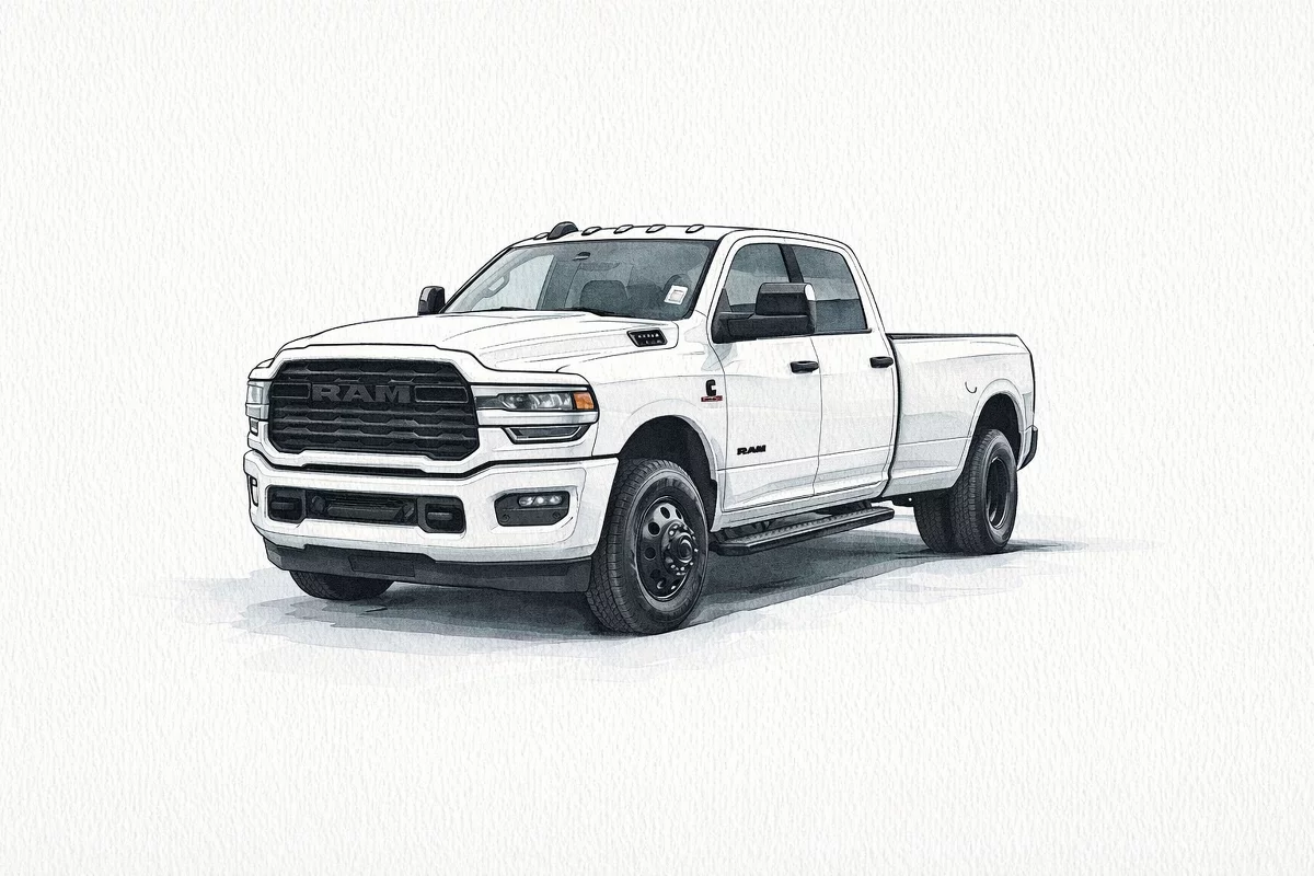 Meet the 2026 RAM 3500 Big Horn in striking White with a Black interior — a heavy-duty truck that blends capability, comfort and confidence. With rugged 4WD, limited-slip differential, LT275/70R18 off-road tires and a full‑size spare, it’s ready for the jobsite or the weekend. Advanced safety and control come standard — ABS with electronic brake assist, traction and stability control, multiple airbags and child safety locks — plus anti-theft protection for peace of mind. Everyday convenience includes keyless entry, remote ignition, separate driver/passenger climate controls, cruise, steering‑wheel controls and automatic headlights with daytime running lights. Seating for six, generous interior space and strong factory coverage (3 yr/36k basic, 10 yr/100k powertrain, 5 yr/100k rust) make this Big Horn a smart, reliable choice — come see it and take a test drive today.
